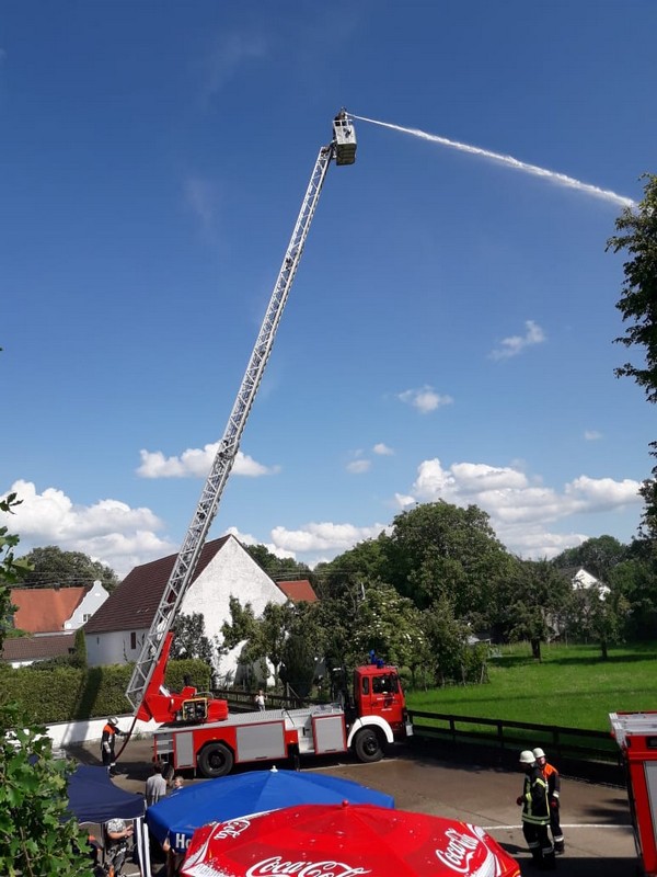 Am Samstag, den 02.06.18, fanden bei strahlendem Sonnenschein zahlreiche Interessierte den Weg zum Feuerwehrgerätehaus in Feldheim, wo sich nicht nur die örtliche Wehr, sondern auch die benachbarte Wehr aus Niederschönenfeld mit ihren Fahrzeugen, Vorführungen und allgemeinen Informationen präsentierten. Unterstützt wurden sie von einigen Kameraden der Feuerwehr aus Rain, die mit ihrem Drehleiter-Fahrzeug vor Ort waren. Komplettiert wurde die Fahrzeug- und Geräteschau schließlich noch von der Werksfeuerwehr von Airbus Helicopters aus Donauwörth, die ihr großes Hilfeleistungslöschgruppenfahrzeug (HLF 20) zur Schau stellten.