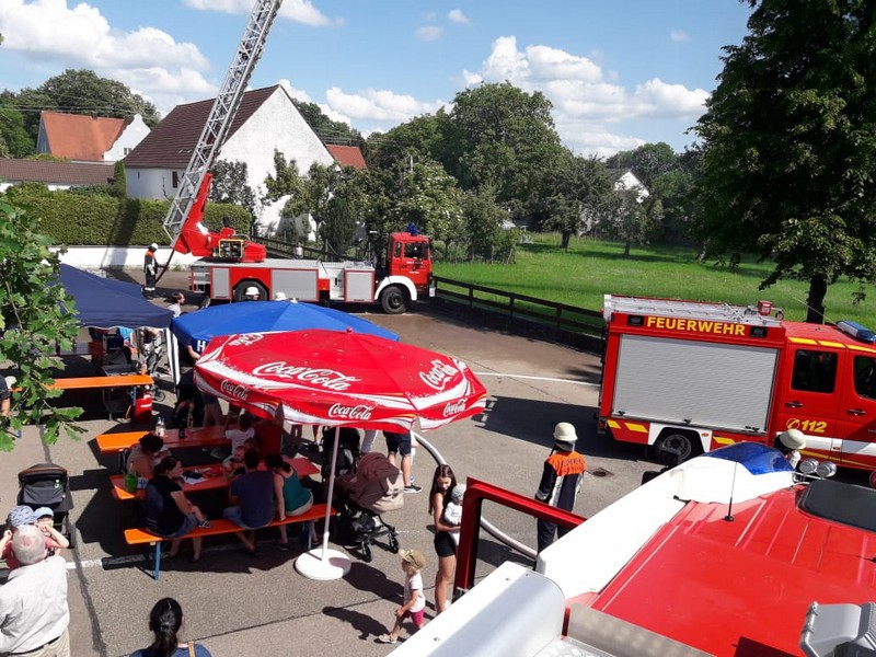 Am Samstag, den 02.06.18, fanden bei strahlendem Sonnenschein zahlreiche Interessierte den Weg zum Feuerwehrgerätehaus in Feldheim, wo sich nicht nur die örtliche Wehr, sondern auch die benachbarte Wehr aus Niederschönenfeld mit ihren Fahrzeugen, Vorführungen und allgemeinen Informationen präsentierten. Unterstützt wurden sie von einigen Kameraden der Feuerwehr aus Rain, die mit ihrem Drehleiter-Fahrzeug vor Ort waren. Komplettiert wurde die Fahrzeug- und Geräteschau schließlich noch von der Werksfeuerwehr von Airbus Helicopters aus Donauwörth, die ihr großes Hilfeleistungslöschgruppenfahrzeug (HLF 20) zur Schau stellten.