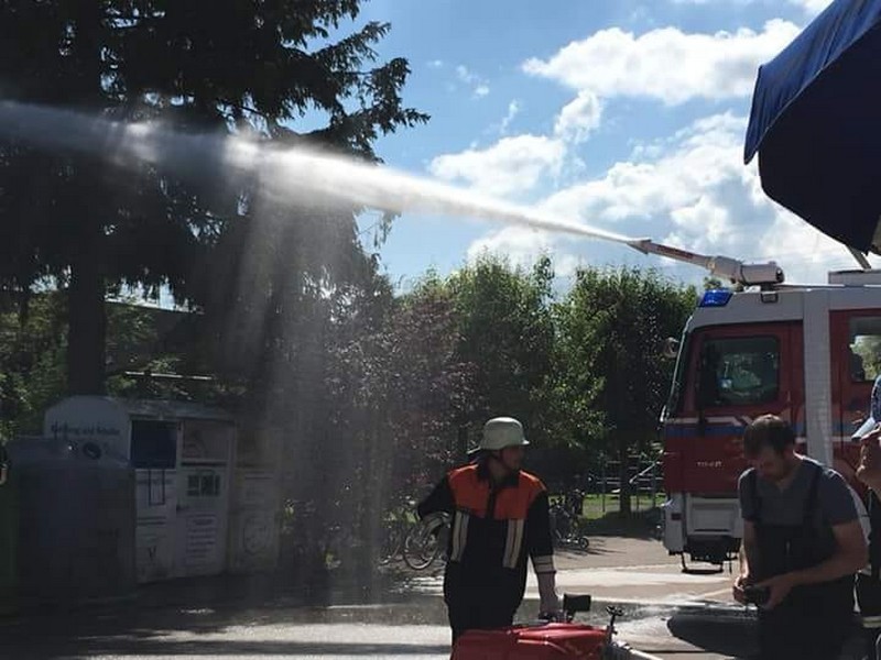 Am Samstag, den 02.06.18, fanden bei strahlendem Sonnenschein zahlreiche Interessierte den Weg zum Feuerwehrgerätehaus in Feldheim, wo sich nicht nur die örtliche Wehr, sondern auch die benachbarte Wehr aus Niederschönenfeld mit ihren Fahrzeugen, Vorführungen und allgemeinen Informationen präsentierten. Unterstützt wurden sie von einigen Kameraden der Feuerwehr aus Rain, die mit ihrem Drehleiter-Fahrzeug vor Ort waren. Komplettiert wurde die Fahrzeug- und Geräteschau schließlich noch von der Werksfeuerwehr von Airbus Helicopters aus Donauwörth, die ihr großes Hilfeleistungslöschgruppenfahrzeug (HLF 20) zur Schau stellten.