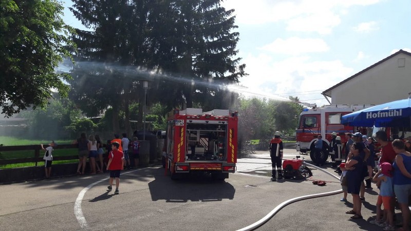 Am Samstag, den 02.06.18, fanden bei strahlendem Sonnenschein zahlreiche Interessierte den Weg zum Feuerwehrgerätehaus in Feldheim, wo sich nicht nur die örtliche Wehr, sondern auch die benachbarte Wehr aus Niederschönenfeld mit ihren Fahrzeugen, Vorführungen und allgemeinen Informationen präsentierten. Unterstützt wurden sie von einigen Kameraden der Feuerwehr aus Rain, die mit ihrem Drehleiter-Fahrzeug vor Ort waren. Komplettiert wurde die Fahrzeug- und Geräteschau schließlich noch von der Werksfeuerwehr von Airbus Helicopters aus Donauwörth, die ihr großes Hilfeleistungslöschgruppenfahrzeug (HLF 20) zur Schau stellten.