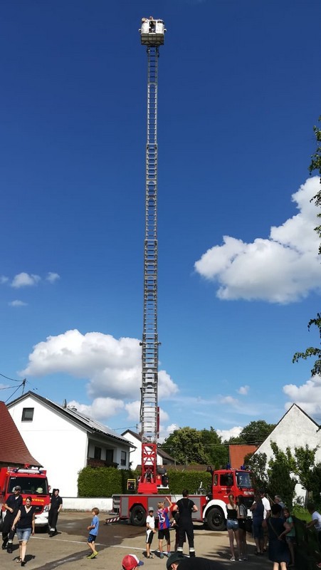 Am Samstag, den 02.06.18, fanden bei strahlendem Sonnenschein zahlreiche Interessierte den Weg zum Feuerwehrgerätehaus in Feldheim, wo sich nicht nur die örtliche Wehr, sondern auch die benachbarte Wehr aus Niederschönenfeld mit ihren Fahrzeugen, Vorführungen und allgemeinen Informationen präsentierten. Unterstützt wurden sie von einigen Kameraden der Feuerwehr aus Rain, die mit ihrem Drehleiter-Fahrzeug vor Ort waren. Komplettiert wurde die Fahrzeug- und Geräteschau schließlich noch von der Werksfeuerwehr von Airbus Helicopters aus Donauwörth, die ihr großes Hilfeleistungslöschgruppenfahrzeug (HLF 20) zur Schau stellten.