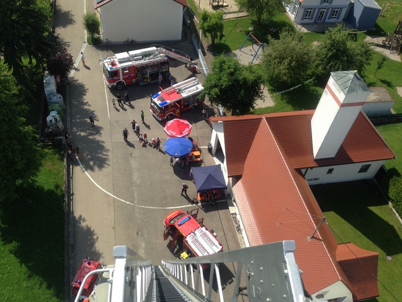 Am Samstag, den 02.06.18, fanden bei strahlendem Sonnenschein zahlreiche Interessierte den Weg zum Feuerwehrgerätehaus in Feldheim, wo sich nicht nur die örtliche Wehr, sondern auch die benachbarte Wehr aus Niederschönenfeld mit ihren Fahrzeugen, Vorführungen und allgemeinen Informationen präsentierten. Unterstützt wurden sie von einigen Kameraden der Feuerwehr aus Rain, die mit ihrem Drehleiter-Fahrzeug vor Ort waren. Komplettiert wurde die Fahrzeug- und Geräteschau schließlich noch von der Werksfeuerwehr von Airbus Helicopters aus Donauwörth, die ihr großes Hilfeleistungslöschgruppenfahrzeug (HLF 20) zur Schau stellten.