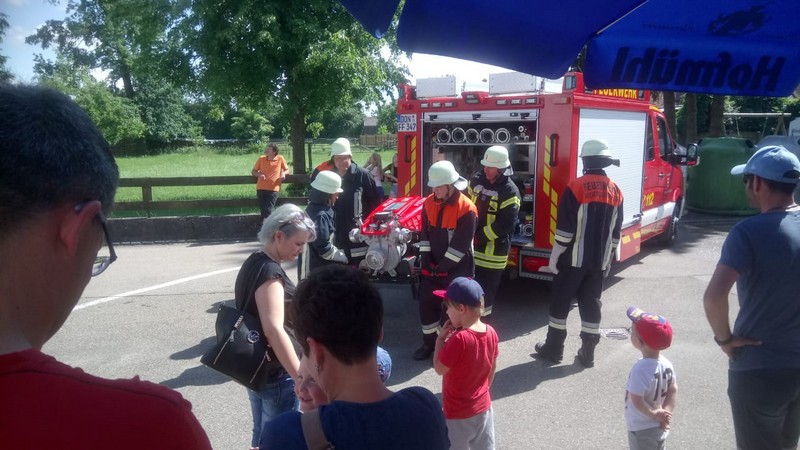 Am Samstag, den 02.06.18, fanden bei strahlendem Sonnenschein zahlreiche Interessierte den Weg zum Feuerwehrgerätehaus in Feldheim, wo sich nicht nur die örtliche Wehr, sondern auch die benachbarte Wehr aus Niederschönenfeld mit ihren Fahrzeugen, Vorführungen und allgemeinen Informationen präsentierten. Unterstützt wurden sie von einigen Kameraden der Feuerwehr aus Rain, die mit ihrem Drehleiter-Fahrzeug vor Ort waren. Komplettiert wurde die Fahrzeug- und Geräteschau schließlich noch von der Werksfeuerwehr von Airbus Helicopters aus Donauwörth, die ihr großes Hilfeleistungslöschgruppenfahrzeug (HLF 20) zur Schau stellten.