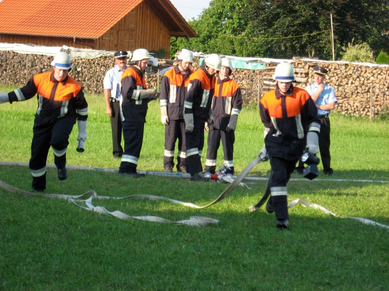 Nachdem die Feldheimer Feuerwehr als erstes am Einsatzort eingetroffen ist, sah die Übung vor, die stark verrauchte Schreinerei bzw. Lackierkammer nach mindestens zwei vermissten Personen zu durchsuchen. So rüsteten sich zwei Atemschutzgeräteträger aus und gingen in das Gebäude. Mit Hilfe des Überdrucklüfters wurde der Rauch aus der Werkstatt gedrängt und beide vermissten Personen schnell und sicher gerettet. Die in der Zwischenzeit eingetroffenen Kameraden aus Niederschönenfeld und Rain machten sich zusammen mit den Feldheimern auf, die Wasserversorgung aufzubauen und den Außenangriff vorzunehmen. Zudem wurde die Drehleiter eingesetzt. Ziel der Übung war es auch, die Ergiebigkeit der Brunnen zu testen, um für den Ernstfall wichtige Erkenntnisse daraus abzuleiten.