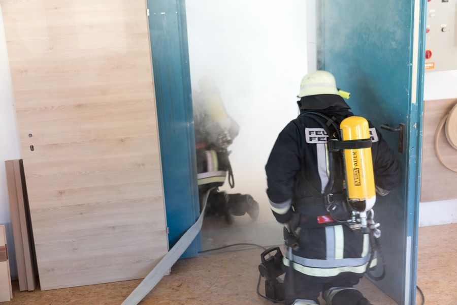 Nachdem die Feldheimer Feuerwehr als erstes am Einsatzort eingetroffen ist, sah die Übung vor, die stark verrauchte Schreinerei bzw. Lackierkammer nach mindestens zwei vermissten Personen zu durchsuchen. So rüsteten sich zwei Atemschutzgeräteträger aus und gingen in das Gebäude. Mit Hilfe des Überdrucklüfters wurde der Rauch aus der Werkstatt gedrängt und beide vermissten Personen schnell und sicher gerettet. Die in der Zwischenzeit eingetroffenen Kameraden aus Niederschönenfeld und Rain machten sich zusammen mit den Feldheimern auf, die Wasserversorgung aufzubauen und den Außenangriff vorzunehmen. Zudem wurde die Drehleiter eingesetzt. Ziel der Übung war es auch, die Ergiebigkeit der Brunnen zu testen, um für den Ernstfall wichtige Erkenntnisse daraus abzuleiten.