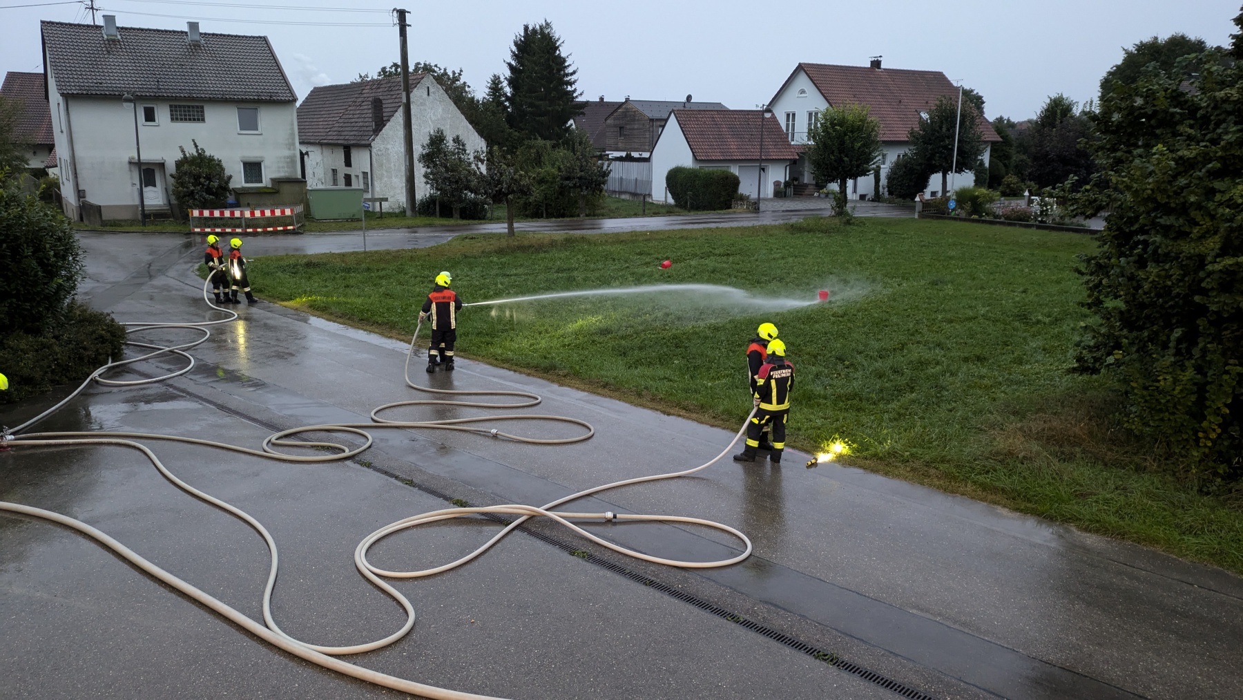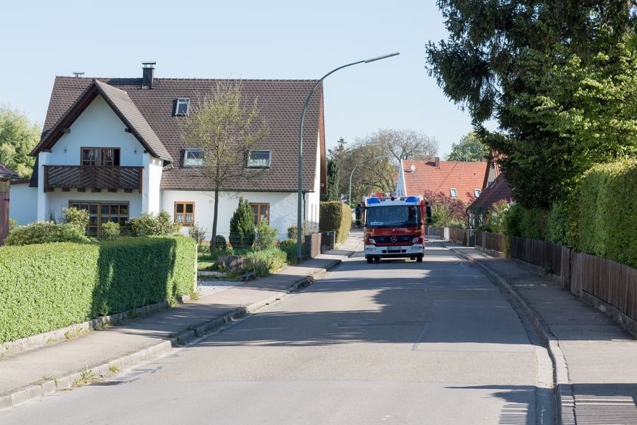 Nachdem die Feldheimer Feuerwehr als erstes am Einsatzort eingetroffen ist, sah die Übung vor, die stark verrauchte Schreinerei bzw. Lackierkammer nach mindestens zwei vermissten Personen zu durchsuchen. So rüsteten sich zwei Atemschutzgeräteträger aus und gingen in das Gebäude. Mit Hilfe des Überdrucklüfters wurde der Rauch aus der Werkstatt gedrängt und beide vermissten Personen schnell und sicher gerettet. Die in der Zwischenzeit eingetroffenen Kameraden aus Niederschönenfeld und Rain machten sich zusammen mit den Feldheimern auf, die Wasserversorgung aufzubauen und den Außenangriff vorzunehmen. Zudem wurde die Drehleiter eingesetzt. Ziel der Übung war es auch, die Ergiebigkeit der Brunnen zu testen, um für den Ernstfall wichtige Erkenntnisse daraus abzuleiten.