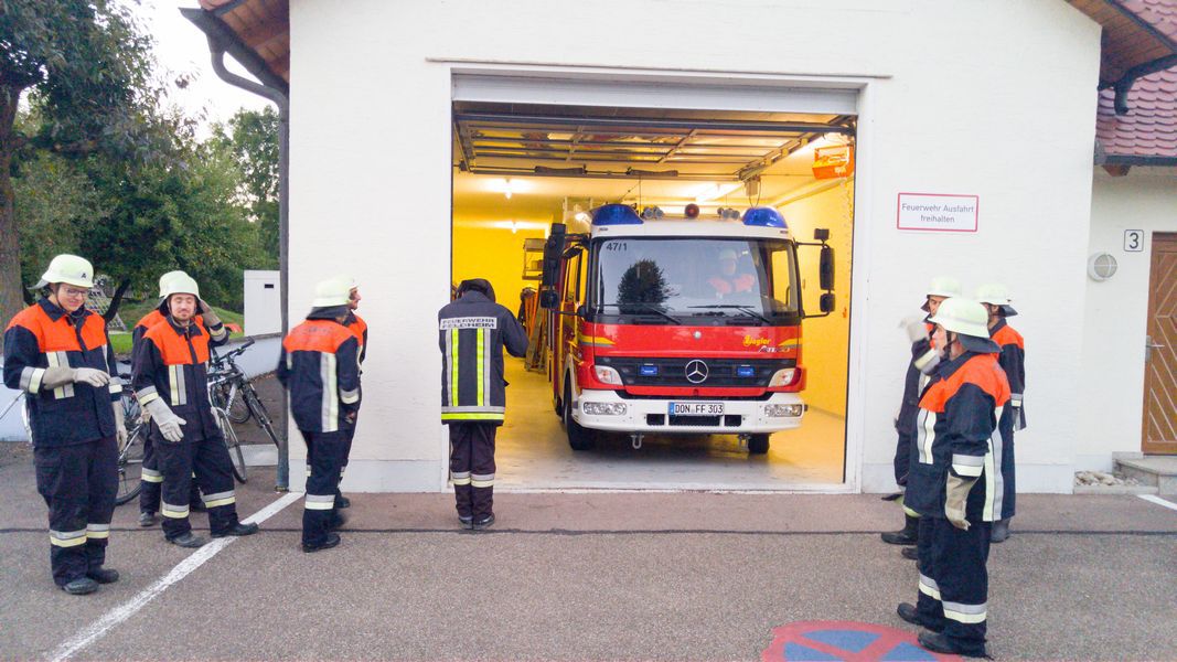 Nachdem die Feldheimer Feuerwehr als erstes am Einsatzort eingetroffen ist, sah die Übung vor, die stark verrauchte Schreinerei bzw. Lackierkammer nach mindestens zwei vermissten Personen zu durchsuchen. So rüsteten sich zwei Atemschutzgeräteträger aus und gingen in das Gebäude. Mit Hilfe des Überdrucklüfters wurde der Rauch aus der Werkstatt gedrängt und beide vermissten Personen schnell und sicher gerettet. Die in der Zwischenzeit eingetroffenen Kameraden aus Niederschönenfeld und Rain machten sich zusammen mit den Feldheimern auf, die Wasserversorgung aufzubauen und den Außenangriff vorzunehmen. Zudem wurde die Drehleiter eingesetzt. Ziel der Übung war es auch, die Ergiebigkeit der Brunnen zu testen, um für den Ernstfall wichtige Erkenntnisse daraus abzuleiten.