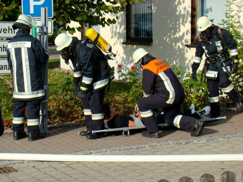 Nachdem die Feldheimer Feuerwehr als erstes am Einsatzort eingetroffen ist, sah die Übung vor, die stark verrauchte Schreinerei bzw. Lackierkammer nach mindestens zwei vermissten Personen zu durchsuchen. So rüsteten sich zwei Atemschutzgeräteträger aus und gingen in das Gebäude. Mit Hilfe des Überdrucklüfters wurde der Rauch aus der Werkstatt gedrängt und beide vermissten Personen schnell und sicher gerettet. Die in der Zwischenzeit eingetroffenen Kameraden aus Niederschönenfeld und Rain machten sich zusammen mit den Feldheimern auf, die Wasserversorgung aufzubauen und den Außenangriff vorzunehmen. Zudem wurde die Drehleiter eingesetzt. Ziel der Übung war es auch, die Ergiebigkeit der Brunnen zu testen, um für den Ernstfall wichtige Erkenntnisse daraus abzuleiten.