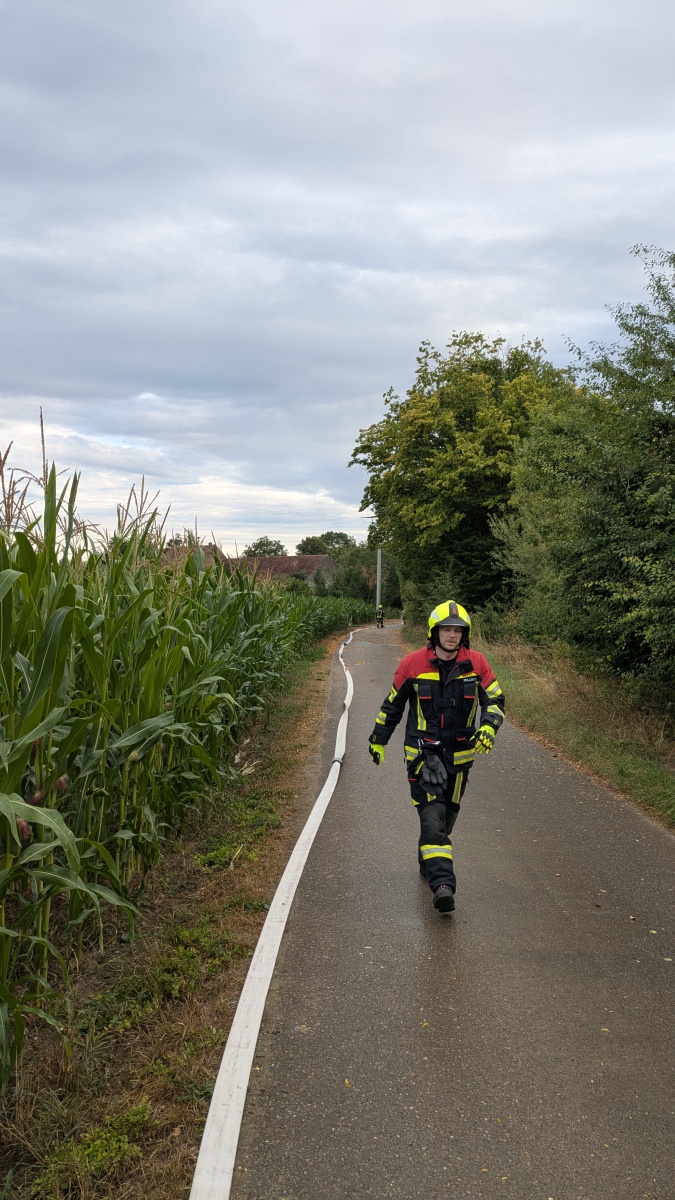 Nachdem die Feldheimer Feuerwehr als erstes am Einsatzort eingetroffen ist, sah die Übung vor, die stark verrauchte Schreinerei bzw. Lackierkammer nach mindestens zwei vermissten Personen zu durchsuchen. So rüsteten sich zwei Atemschutzgeräteträger aus und gingen in das Gebäude. Mit Hilfe des Überdrucklüfters wurde der Rauch aus der Werkstatt gedrängt und beide vermissten Personen schnell und sicher gerettet. Die in der Zwischenzeit eingetroffenen Kameraden aus Niederschönenfeld und Rain machten sich zusammen mit den Feldheimern auf, die Wasserversorgung aufzubauen und den Außenangriff vorzunehmen. Zudem wurde die Drehleiter eingesetzt. Ziel der Übung war es auch, die Ergiebigkeit der Brunnen zu testen, um für den Ernstfall wichtige Erkenntnisse daraus abzuleiten.