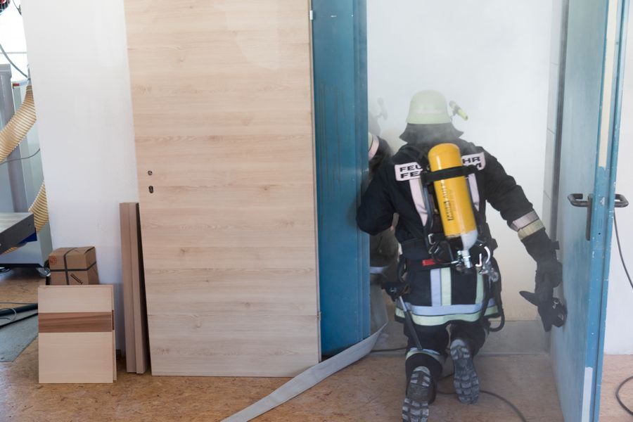 Nachdem die Feldheimer Feuerwehr als erstes am Einsatzort eingetroffen ist, sah die Übung vor, die stark verrauchte Schreinerei bzw. Lackierkammer nach mindestens zwei vermissten Personen zu durchsuchen. So rüsteten sich zwei Atemschutzgeräteträger aus und gingen in das Gebäude. Mit Hilfe des Überdrucklüfters wurde der Rauch aus der Werkstatt gedrängt und beide vermissten Personen schnell und sicher gerettet. Die in der Zwischenzeit eingetroffenen Kameraden aus Niederschönenfeld und Rain machten sich zusammen mit den Feldheimern auf, die Wasserversorgung aufzubauen und den Außenangriff vorzunehmen. Zudem wurde die Drehleiter eingesetzt. Ziel der Übung war es auch, die Ergiebigkeit der Brunnen zu testen, um für den Ernstfall wichtige Erkenntnisse daraus abzuleiten.