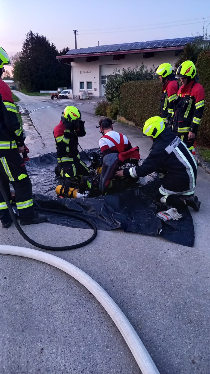 Nachdem die Feldheimer Feuerwehr als erstes am Einsatzort eingetroffen ist, sah die Übung vor, die stark verrauchte Schreinerei bzw. Lackierkammer nach mindestens zwei vermissten Personen zu durchsuchen. So rüsteten sich zwei Atemschutzgeräteträger aus und gingen in das Gebäude. Mit Hilfe des Überdrucklüfters wurde der Rauch aus der Werkstatt gedrängt und beide vermissten Personen schnell und sicher gerettet. Die in der Zwischenzeit eingetroffenen Kameraden aus Niederschönenfeld und Rain machten sich zusammen mit den Feldheimern auf, die Wasserversorgung aufzubauen und den Außenangriff vorzunehmen. Zudem wurde die Drehleiter eingesetzt. Ziel der Übung war es auch, die Ergiebigkeit der Brunnen zu testen, um für den Ernstfall wichtige Erkenntnisse daraus abzuleiten.