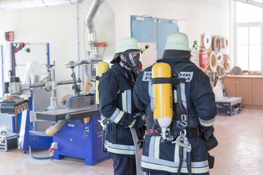 Nachdem die Feldheimer Feuerwehr als erstes am Einsatzort eingetroffen ist, sah die Übung vor, die stark verrauchte Schreinerei bzw. Lackierkammer nach mindestens zwei vermissten Personen zu durchsuchen. So rüsteten sich zwei Atemschutzgeräteträger aus und gingen in das Gebäude. Mit Hilfe des Überdrucklüfters wurde der Rauch aus der Werkstatt gedrängt und beide vermissten Personen schnell und sicher gerettet. Die in der Zwischenzeit eingetroffenen Kameraden aus Niederschönenfeld und Rain machten sich zusammen mit den Feldheimern auf, die Wasserversorgung aufzubauen und den Außenangriff vorzunehmen. Zudem wurde die Drehleiter eingesetzt. Ziel der Übung war es auch, die Ergiebigkeit der Brunnen zu testen, um für den Ernstfall wichtige Erkenntnisse daraus abzuleiten.