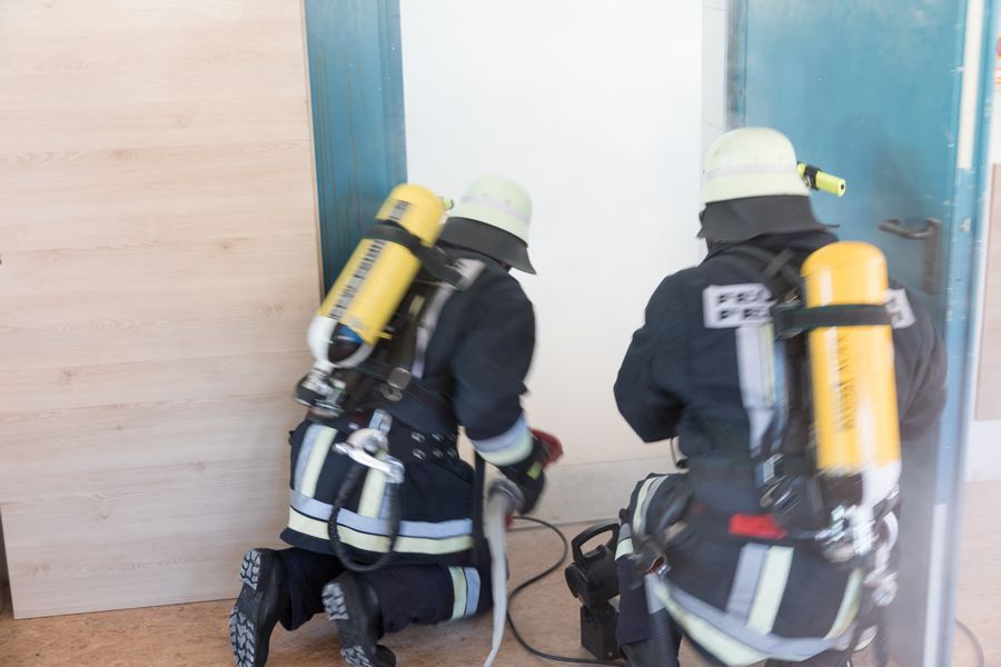 Nachdem die Feldheimer Feuerwehr als erstes am Einsatzort eingetroffen ist, sah die Übung vor, die stark verrauchte Schreinerei bzw. Lackierkammer nach mindestens zwei vermissten Personen zu durchsuchen. So rüsteten sich zwei Atemschutzgeräteträger aus und gingen in das Gebäude. Mit Hilfe des Überdrucklüfters wurde der Rauch aus der Werkstatt gedrängt und beide vermissten Personen schnell und sicher gerettet. Die in der Zwischenzeit eingetroffenen Kameraden aus Niederschönenfeld und Rain machten sich zusammen mit den Feldheimern auf, die Wasserversorgung aufzubauen und den Außenangriff vorzunehmen. Zudem wurde die Drehleiter eingesetzt. Ziel der Übung war es auch, die Ergiebigkeit der Brunnen zu testen, um für den Ernstfall wichtige Erkenntnisse daraus abzuleiten.