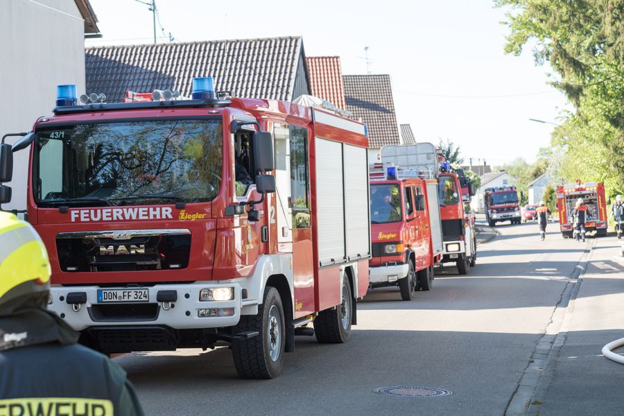 Nachdem die Feldheimer Feuerwehr als erstes am Einsatzort eingetroffen ist, sah die Übung vor, die stark verrauchte Schreinerei bzw. Lackierkammer nach mindestens zwei vermissten Personen zu durchsuchen. So rüsteten sich zwei Atemschutzgeräteträger aus und gingen in das Gebäude. Mit Hilfe des Überdrucklüfters wurde der Rauch aus der Werkstatt gedrängt und beide vermissten Personen schnell und sicher gerettet. Die in der Zwischenzeit eingetroffenen Kameraden aus Niederschönenfeld und Rain machten sich zusammen mit den Feldheimern auf, die Wasserversorgung aufzubauen und den Außenangriff vorzunehmen. Zudem wurde die Drehleiter eingesetzt. Ziel der Übung war es auch, die Ergiebigkeit der Brunnen zu testen, um für den Ernstfall wichtige Erkenntnisse daraus abzuleiten.