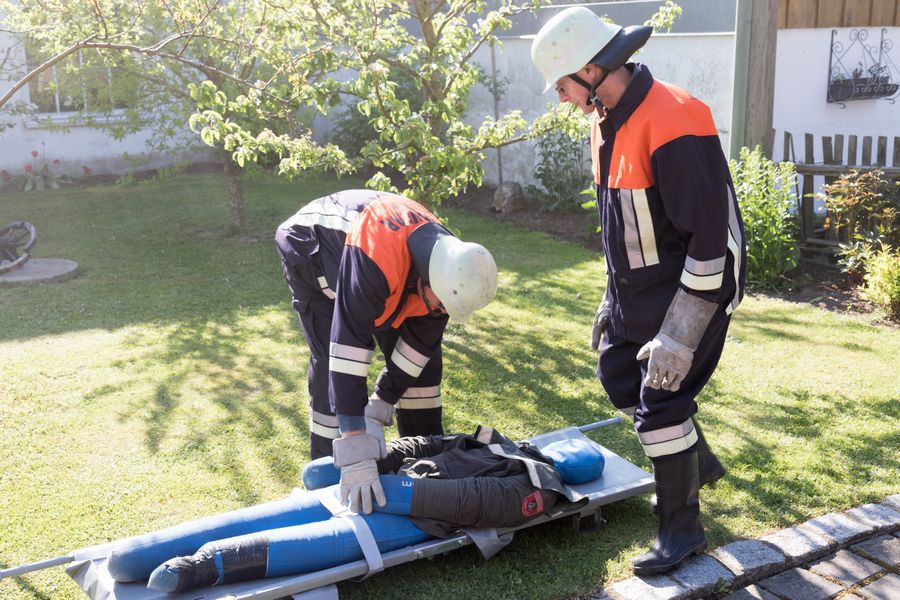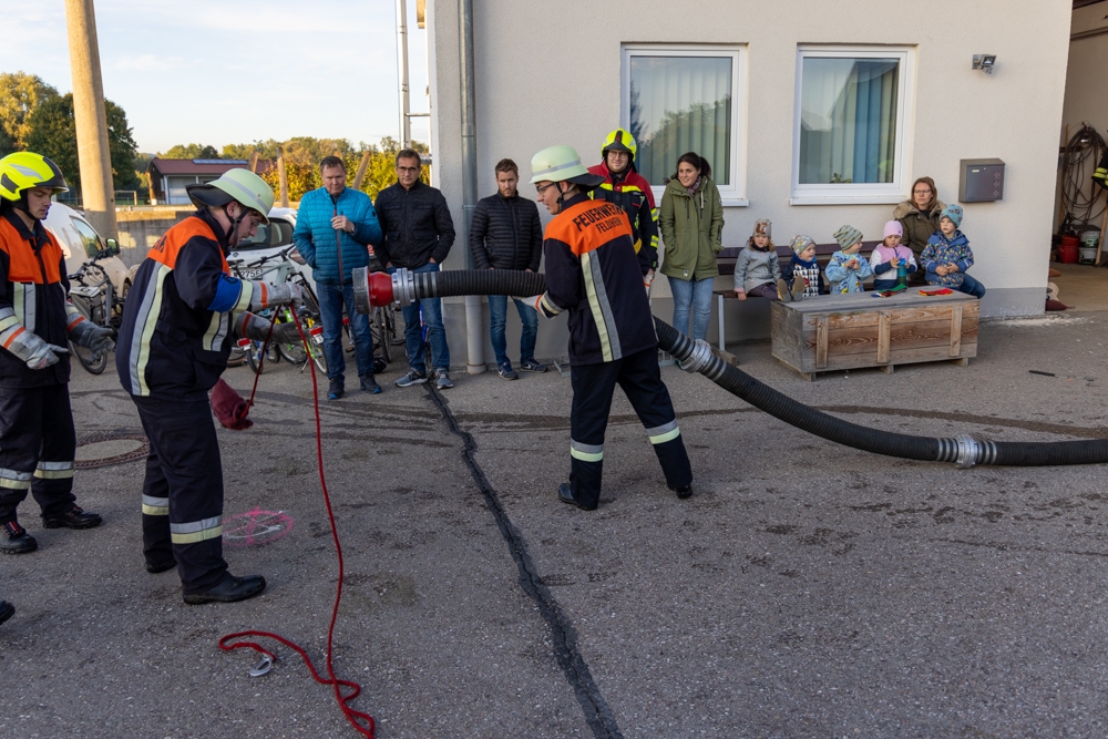 Nachdem die Feldheimer Feuerwehr als erstes am Einsatzort eingetroffen ist, sah die Übung vor, die stark verrauchte Schreinerei bzw. Lackierkammer nach mindestens zwei vermissten Personen zu durchsuchen. So rüsteten sich zwei Atemschutzgeräteträger aus und gingen in das Gebäude. Mit Hilfe des Überdrucklüfters wurde der Rauch aus der Werkstatt gedrängt und beide vermissten Personen schnell und sicher gerettet. Die in der Zwischenzeit eingetroffenen Kameraden aus Niederschönenfeld und Rain machten sich zusammen mit den Feldheimern auf, die Wasserversorgung aufzubauen und den Außenangriff vorzunehmen. Zudem wurde die Drehleiter eingesetzt. Ziel der Übung war es auch, die Ergiebigkeit der Brunnen zu testen, um für den Ernstfall wichtige Erkenntnisse daraus abzuleiten.