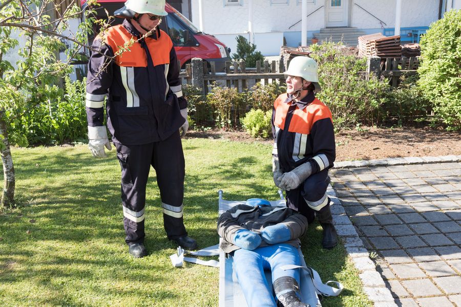Nachdem die Feldheimer Feuerwehr als erstes am Einsatzort eingetroffen ist, sah die Übung vor, die stark verrauchte Schreinerei bzw. Lackierkammer nach mindestens zwei vermissten Personen zu durchsuchen. So rüsteten sich zwei Atemschutzgeräteträger aus und gingen in das Gebäude. Mit Hilfe des Überdrucklüfters wurde der Rauch aus der Werkstatt gedrängt und beide vermissten Personen schnell und sicher gerettet. Die in der Zwischenzeit eingetroffenen Kameraden aus Niederschönenfeld und Rain machten sich zusammen mit den Feldheimern auf, die Wasserversorgung aufzubauen und den Außenangriff vorzunehmen. Zudem wurde die Drehleiter eingesetzt. Ziel der Übung war es auch, die Ergiebigkeit der Brunnen zu testen, um für den Ernstfall wichtige Erkenntnisse daraus abzuleiten.