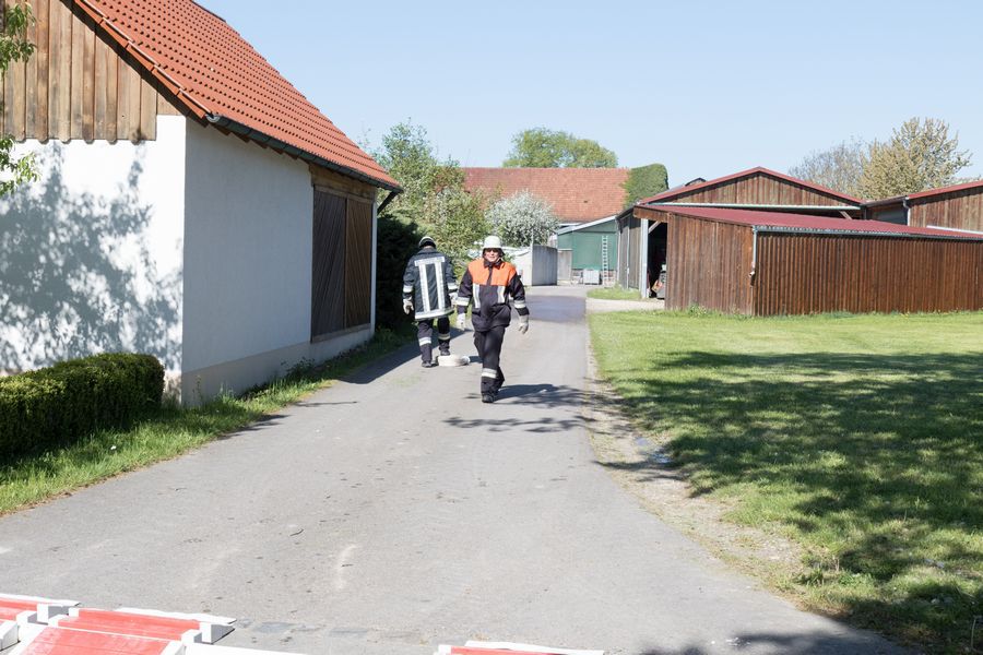 Nachdem die Feldheimer Feuerwehr als erstes am Einsatzort eingetroffen ist, sah die Übung vor, die stark verrauchte Schreinerei bzw. Lackierkammer nach mindestens zwei vermissten Personen zu durchsuchen. So rüsteten sich zwei Atemschutzgeräteträger aus und gingen in das Gebäude. Mit Hilfe des Überdrucklüfters wurde der Rauch aus der Werkstatt gedrängt und beide vermissten Personen schnell und sicher gerettet. Die in der Zwischenzeit eingetroffenen Kameraden aus Niederschönenfeld und Rain machten sich zusammen mit den Feldheimern auf, die Wasserversorgung aufzubauen und den Außenangriff vorzunehmen. Zudem wurde die Drehleiter eingesetzt. Ziel der Übung war es auch, die Ergiebigkeit der Brunnen zu testen, um für den Ernstfall wichtige Erkenntnisse daraus abzuleiten.