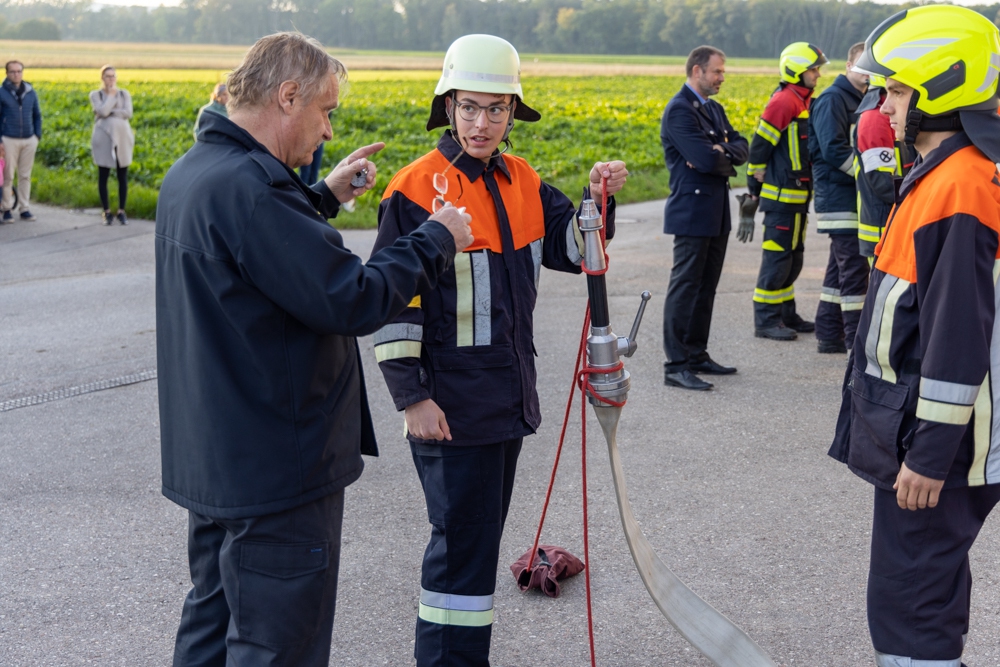 Nachdem die Feldheimer Feuerwehr als erstes am Einsatzort eingetroffen ist, sah die Übung vor, die stark verrauchte Schreinerei bzw. Lackierkammer nach mindestens zwei vermissten Personen zu durchsuchen. So rüsteten sich zwei Atemschutzgeräteträger aus und gingen in das Gebäude. Mit Hilfe des Überdrucklüfters wurde der Rauch aus der Werkstatt gedrängt und beide vermissten Personen schnell und sicher gerettet. Die in der Zwischenzeit eingetroffenen Kameraden aus Niederschönenfeld und Rain machten sich zusammen mit den Feldheimern auf, die Wasserversorgung aufzubauen und den Außenangriff vorzunehmen. Zudem wurde die Drehleiter eingesetzt. Ziel der Übung war es auch, die Ergiebigkeit der Brunnen zu testen, um für den Ernstfall wichtige Erkenntnisse daraus abzuleiten.
