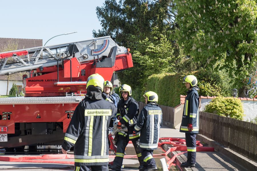 Nachdem die Feldheimer Feuerwehr als erstes am Einsatzort eingetroffen ist, sah die Übung vor, die stark verrauchte Schreinerei bzw. Lackierkammer nach mindestens zwei vermissten Personen zu durchsuchen. So rüsteten sich zwei Atemschutzgeräteträger aus und gingen in das Gebäude. Mit Hilfe des Überdrucklüfters wurde der Rauch aus der Werkstatt gedrängt und beide vermissten Personen schnell und sicher gerettet. Die in der Zwischenzeit eingetroffenen Kameraden aus Niederschönenfeld und Rain machten sich zusammen mit den Feldheimern auf, die Wasserversorgung aufzubauen und den Außenangriff vorzunehmen. Zudem wurde die Drehleiter eingesetzt. Ziel der Übung war es auch, die Ergiebigkeit der Brunnen zu testen, um für den Ernstfall wichtige Erkenntnisse daraus abzuleiten.