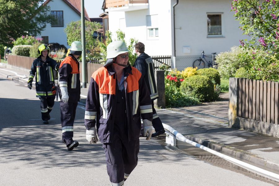 Den Abschluss der drei neu aufgebauten Frühjahrsübungen bildete eine Einsatzübung bei der Schreinerei Schmid in Feldheim, die zusammen mit den Wehren aus Niederschönenfeld und Rain am Lech am Sonntag, den 08.05.2016 durchgeführt wurde. Dabei konnte das neu erlernte bzw. aufgefrischte Wissen gleich in die Praxis umgesetzt werden. Den insgesamt 50 Feuerwehrleuten bot sich dabei ein breites Einsatzspektrum, welches zielstrebig und gekonnt abgearbeitet wurde.