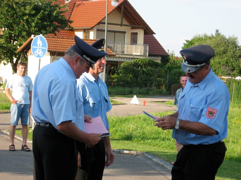 Nachdem die Feldheimer Feuerwehr als erstes am Einsatzort eingetroffen ist, sah die Übung vor, die stark verrauchte Schreinerei bzw. Lackierkammer nach mindestens zwei vermissten Personen zu durchsuchen. So rüsteten sich zwei Atemschutzgeräteträger aus und gingen in das Gebäude. Mit Hilfe des Überdrucklüfters wurde der Rauch aus der Werkstatt gedrängt und beide vermissten Personen schnell und sicher gerettet. Die in der Zwischenzeit eingetroffenen Kameraden aus Niederschönenfeld und Rain machten sich zusammen mit den Feldheimern auf, die Wasserversorgung aufzubauen und den Außenangriff vorzunehmen. Zudem wurde die Drehleiter eingesetzt. Ziel der Übung war es auch, die Ergiebigkeit der Brunnen zu testen, um für den Ernstfall wichtige Erkenntnisse daraus abzuleiten.