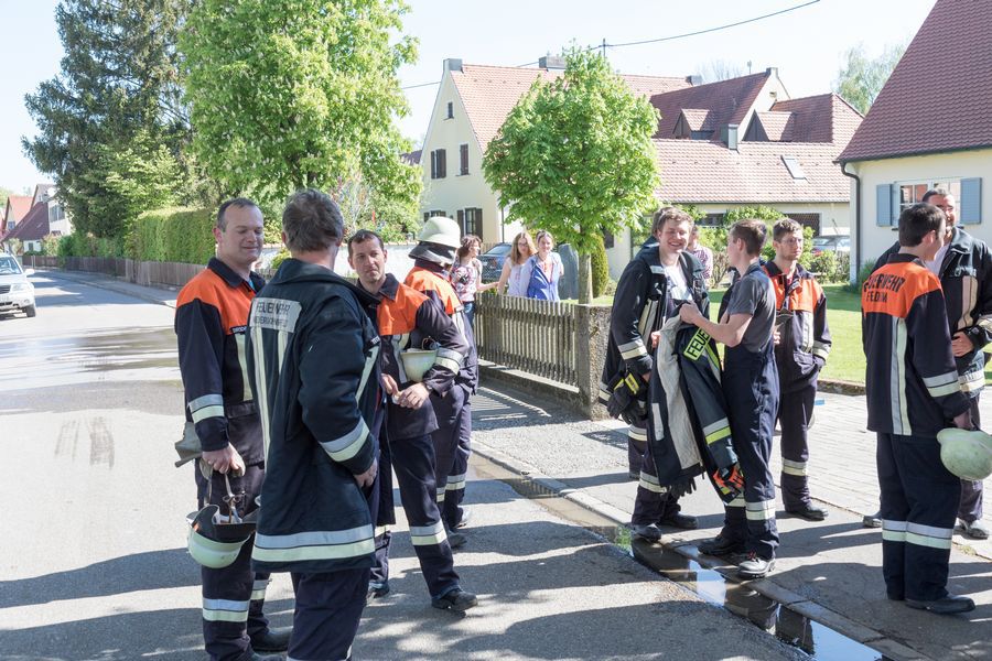 Den Abschluss der drei neu aufgebauten Frühjahrsübungen bildete eine Einsatzübung bei der Schreinerei Schmid in Feldheim, die zusammen mit den Wehren aus Niederschönenfeld und Rain am Lech am Sonntag, den 08.05.2016 durchgeführt wurde. Dabei konnte das neu erlernte bzw. aufgefrischte Wissen gleich in die Praxis umgesetzt werden. Den insgesamt 50 Feuerwehrleuten bot sich dabei ein breites Einsatzspektrum, welches zielstrebig und gekonnt abgearbeitet wurde.