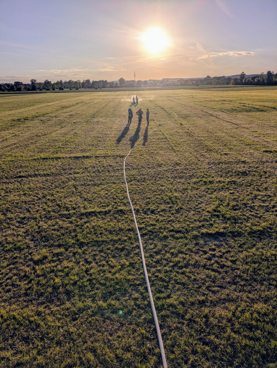 Nachdem die Feldheimer Feuerwehr als erstes am Einsatzort eingetroffen ist, sah die Übung vor, die stark verrauchte Schreinerei bzw. Lackierkammer nach mindestens zwei vermissten Personen zu durchsuchen. So rüsteten sich zwei Atemschutzgeräteträger aus und gingen in das Gebäude. Mit Hilfe des Überdrucklüfters wurde der Rauch aus der Werkstatt gedrängt und beide vermissten Personen schnell und sicher gerettet. Die in der Zwischenzeit eingetroffenen Kameraden aus Niederschönenfeld und Rain machten sich zusammen mit den Feldheimern auf, die Wasserversorgung aufzubauen und den Außenangriff vorzunehmen. Zudem wurde die Drehleiter eingesetzt. Ziel der Übung war es auch, die Ergiebigkeit der Brunnen zu testen, um für den Ernstfall wichtige Erkenntnisse daraus abzuleiten.
