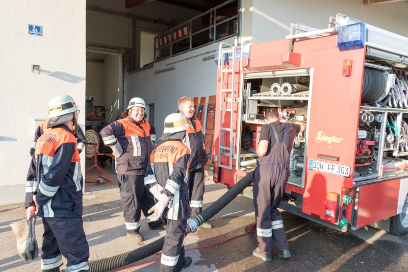 Nachdem die Feldheimer Feuerwehr als erstes am Einsatzort eingetroffen ist, sah die Übung vor, die stark verrauchte Schreinerei bzw. Lackierkammer nach mindestens zwei vermissten Personen zu durchsuchen. So rüsteten sich zwei Atemschutzgeräteträger aus und gingen in das Gebäude. Mit Hilfe des Überdrucklüfters wurde der Rauch aus der Werkstatt gedrängt und beide vermissten Personen schnell und sicher gerettet. Die in der Zwischenzeit eingetroffenen Kameraden aus Niederschönenfeld und Rain machten sich zusammen mit den Feldheimern auf, die Wasserversorgung aufzubauen und den Außenangriff vorzunehmen. Zudem wurde die Drehleiter eingesetzt. Ziel der Übung war es auch, die Ergiebigkeit der Brunnen zu testen, um für den Ernstfall wichtige Erkenntnisse daraus abzuleiten.